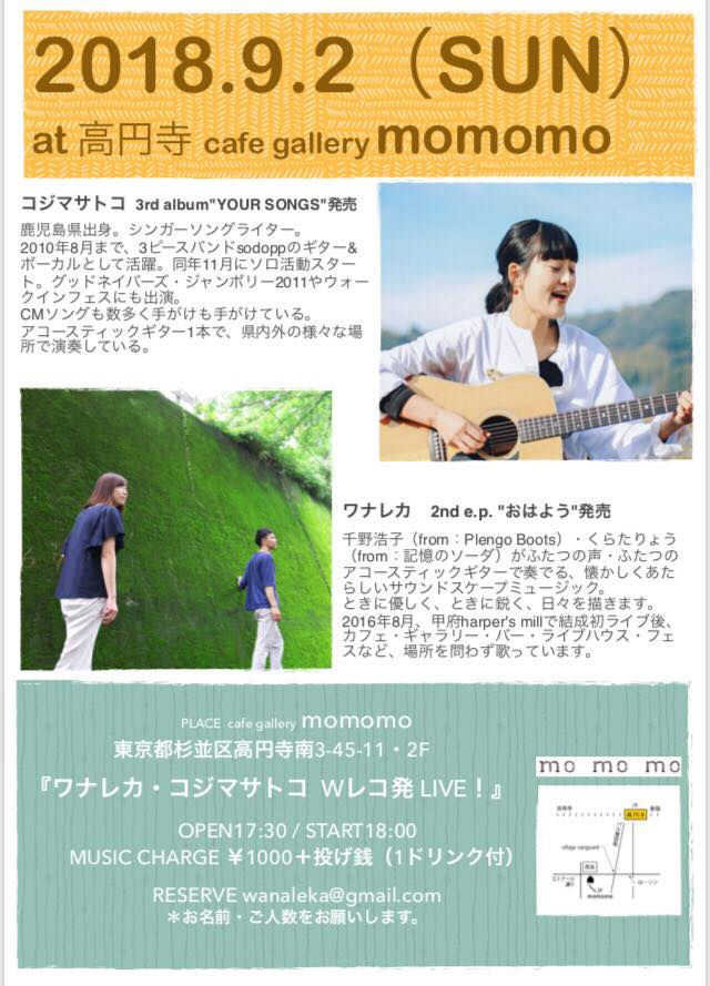 2018年9月2日(日) 『ワナレカ・コジマサトコ Wレコ発ライブ』 @高円寺 momomo